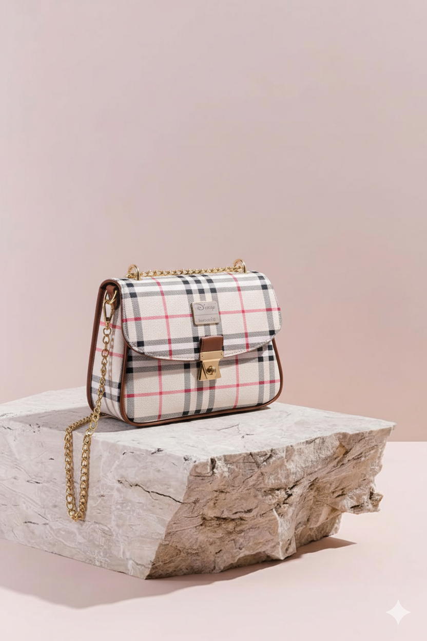 A timeless check-pattern bag featuring a sleek gold chain and secure lock closure. Its elegant design and neutral tones make it ideal for both casual outings and special occasions.